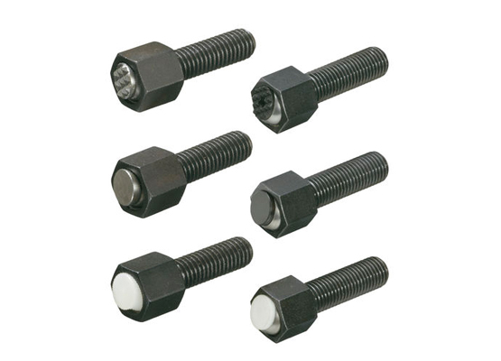 Clamping screws are mechanical elements which use screw thrust for workpiece fixing and positioning. Point contact by the full ball securely fixes the workpiece. They include several varieties of tip ball shape and material, which can be selected according to the application.